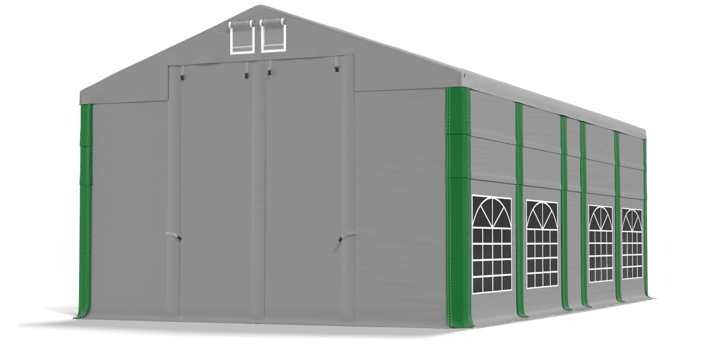 1 - Dach modułowy MS PVC (polichlorek winylu) ok. 580 g/m2    2 - Podwójna wentylacja z obu stron     3 - Wjazdy typu Slide & Roll     4 - Mocne zamki YKK przy wjazdach     5 - Rzepy uszczelniające     6 - Podniesienie ściany bocznej SD PVC ok. 2 x 1,5 m(polichlorek winylu) ok. 500 g/m2     7 - Wymienne Maskownice z rzepami uszczelniającymi     8 - Ściany boczne SD PVC 2 x 2 m (polichlorek winylu) ok. 500 g/m2 - Okna witrażowe 140 x 130 cm     9 - Dodatkowy fartuch retencyjny