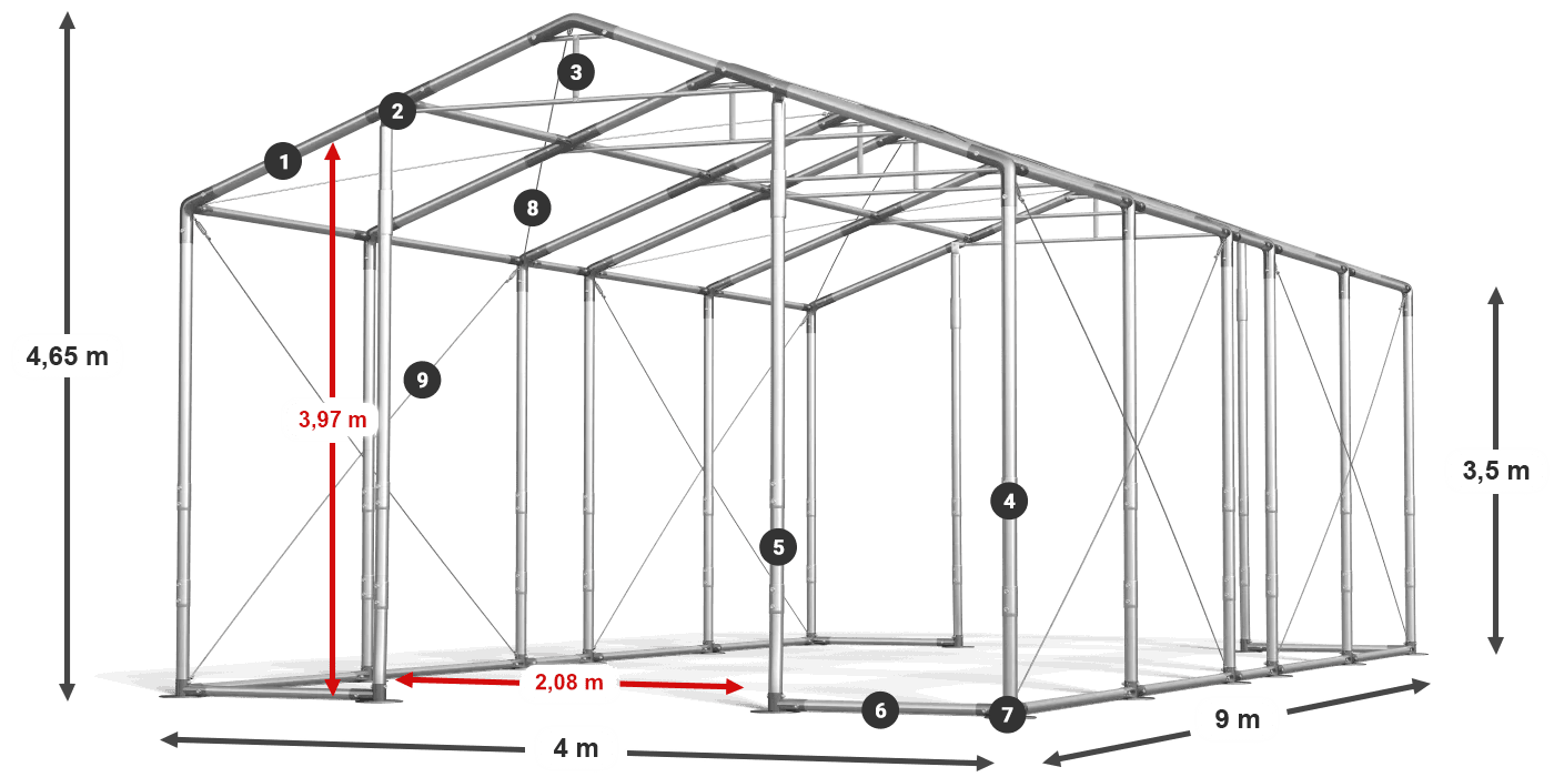 1 - Rury konstrukcyjne fi ok. 50 mm     2 - Łączniki konstrukcji fi ok. 54 mm     3 - Wzmocniona konstrukcja dachowa     4 - Mocne podwójne śruby, które przechodzą na wylot     5 - Wzmocnienia wjazdów     6 - Wzmocniona konstrukcja podłogowa     7 - Powiększone stopy fi 14 cm     8 - Naciągi dachowe     9 - Naciągi boczne