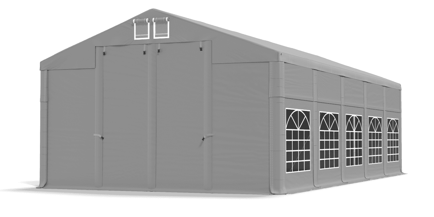 3. Otwarte główne wejścia/wjazdy oraz odpięte wszystkie ścianki z jednego boku namiotu.