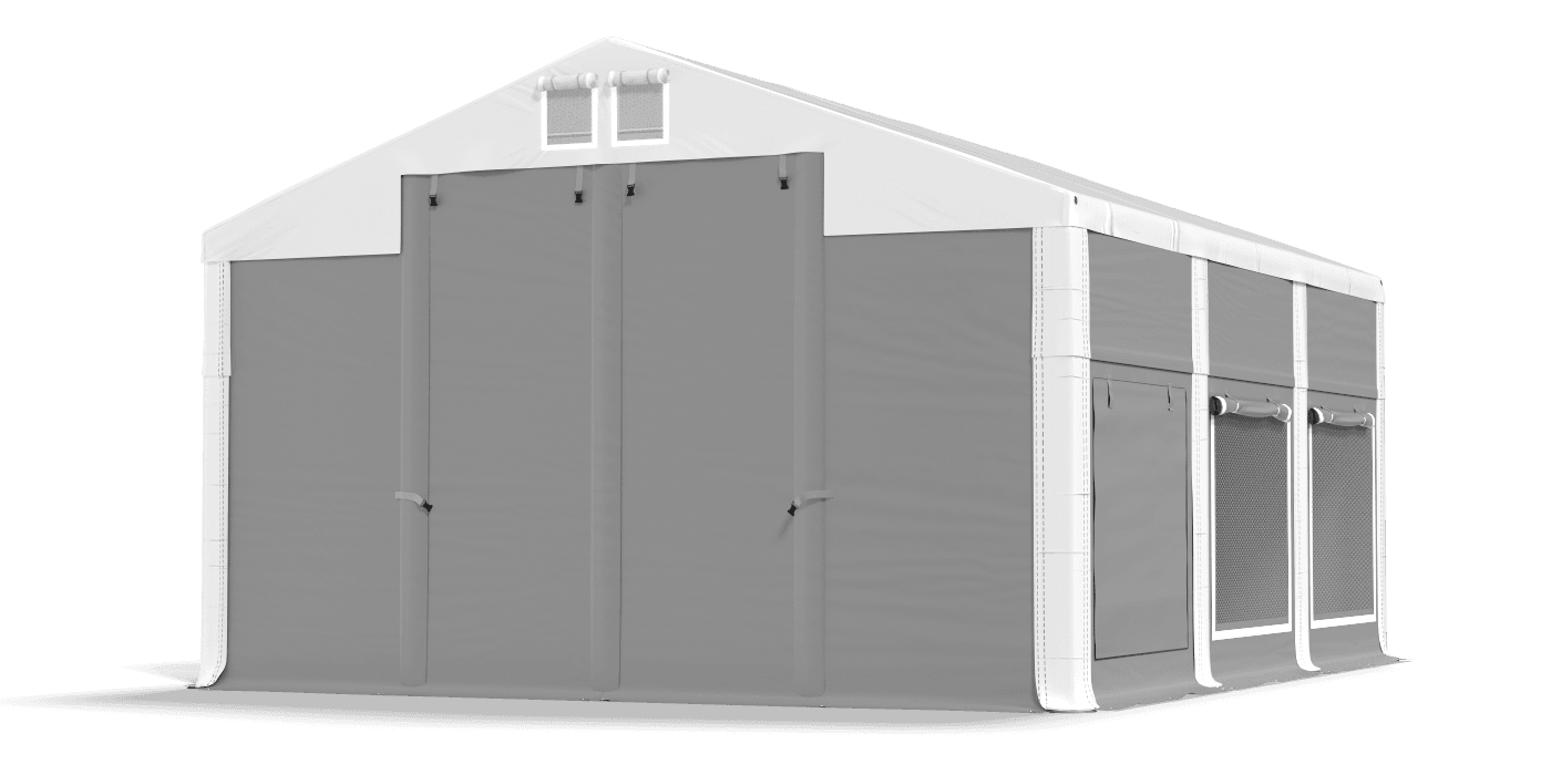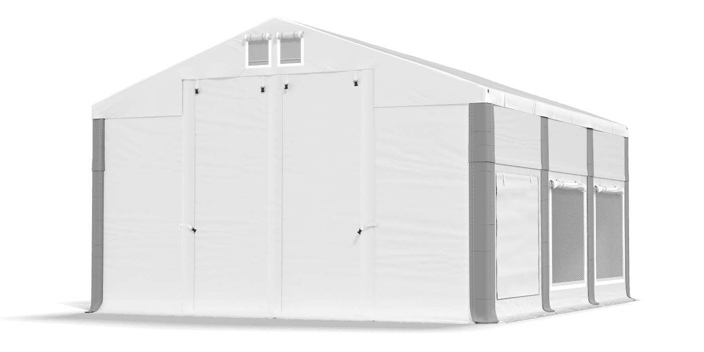 3. Otwarte główne wejścia/wjazdy oraz odpięte wszystkie ścianki z jednego boku namiotu.