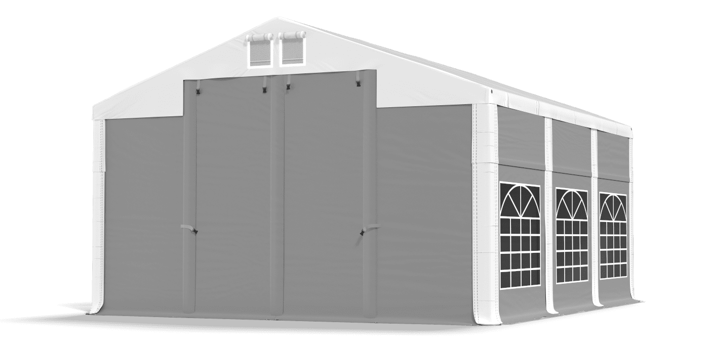 3. Otwarte główne wejścia/wjazdy oraz odpięte wszystkie ścianki z jednego boku namiotu.