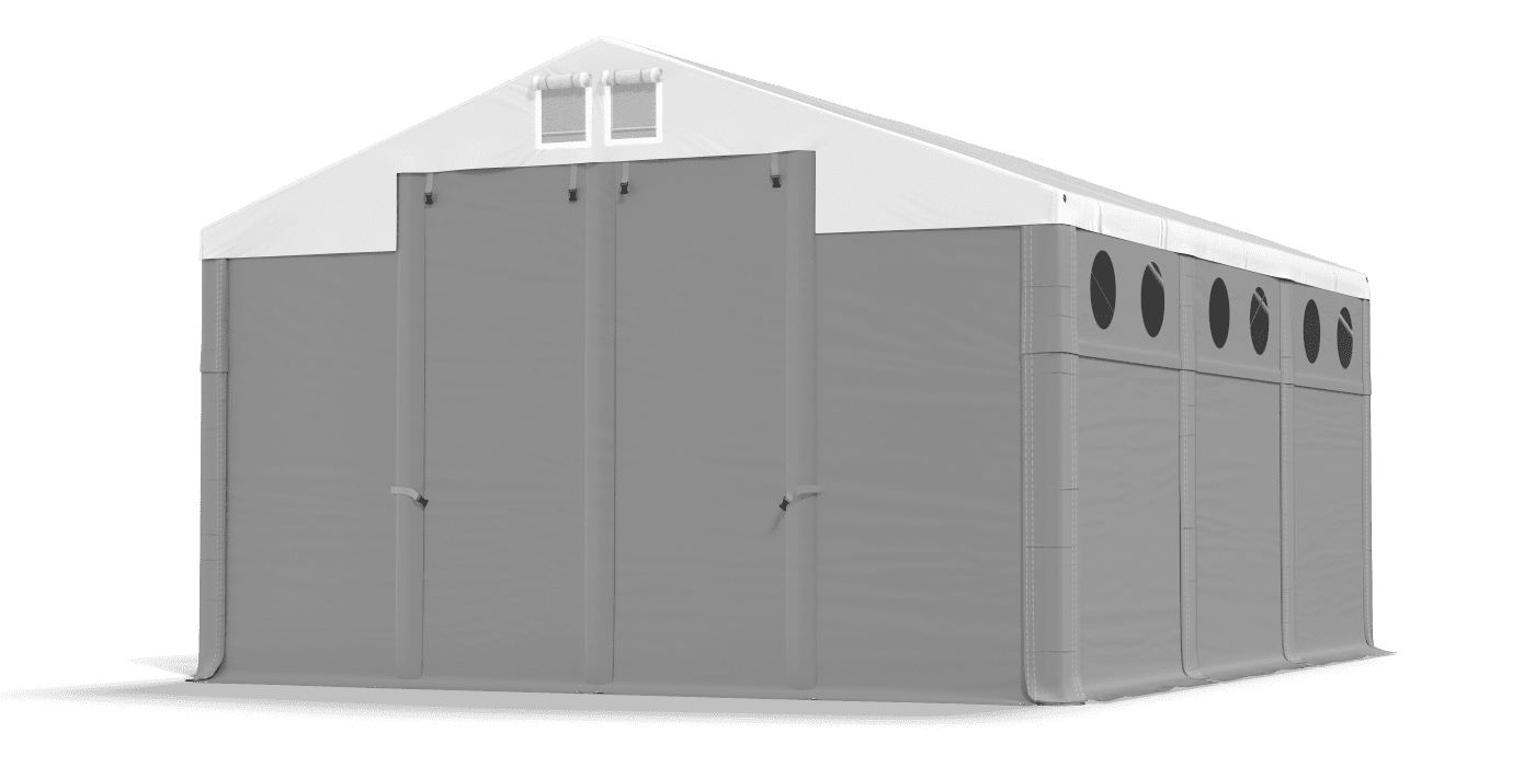 3. Otwarte główne wejścia/wjazdy oraz odpięte wszystkie ścianki z jednego boku namiotu.