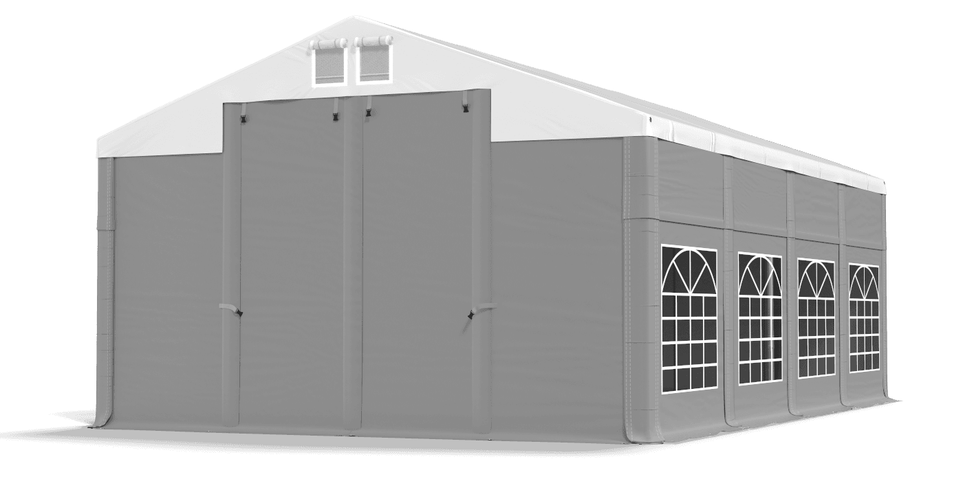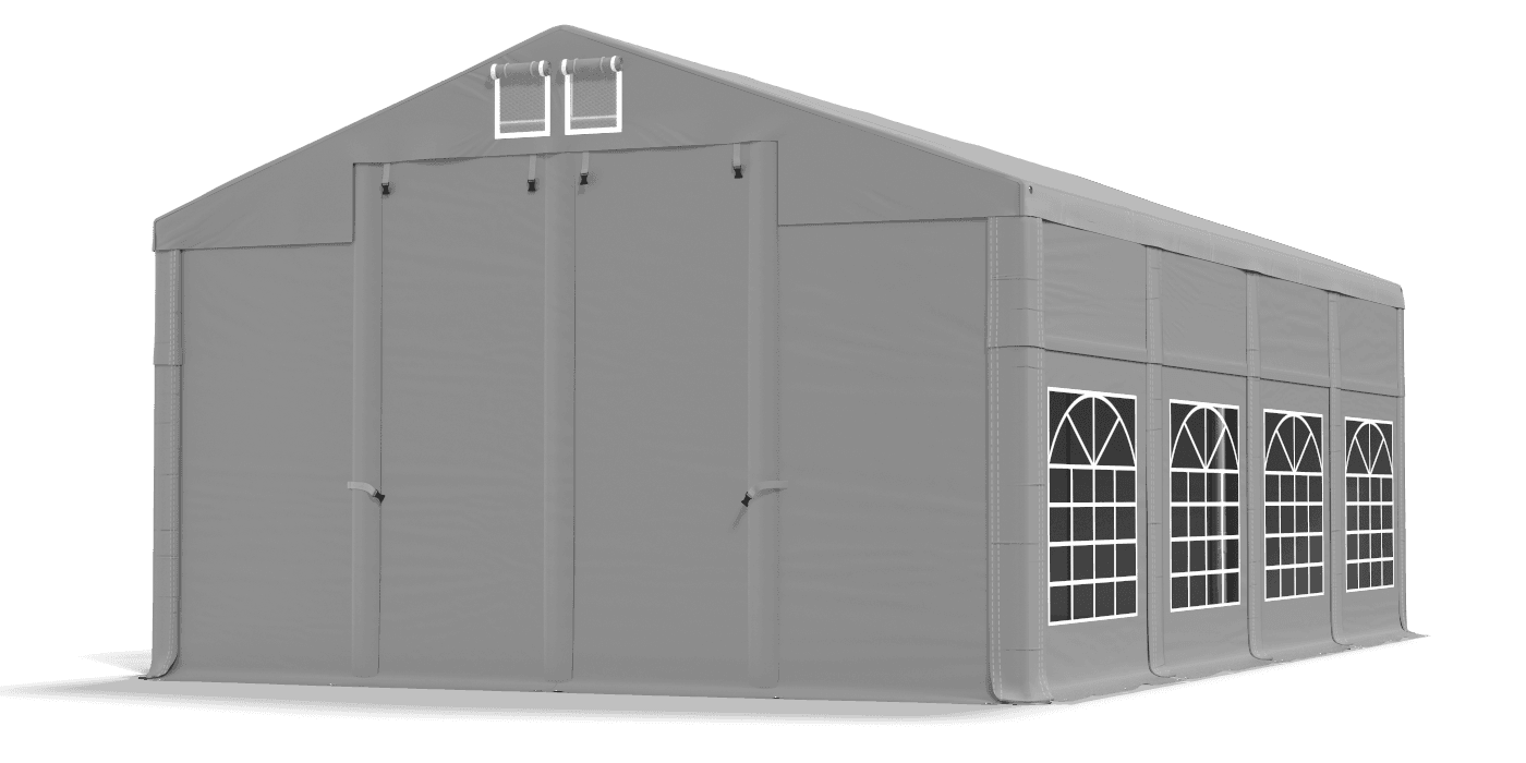 3. Otwarte główne wejścia/wjazdy oraz odpięte wszystkie ścianki z jednego boku namiotu.