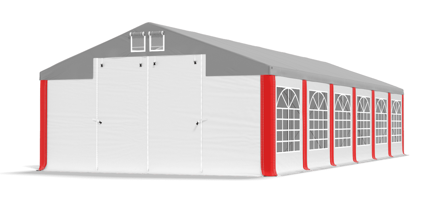 1 - Dach modułowy ognioodporny FR PVC (polichlorek winylu) ok. 620 g/m2 2 - Podwójna wentylacja po obu stronach namiotu 3 - Wjazdy typu Slide & Roll 4 - Mocne zamki YKK przy wjazdach 5 - Rzepy uszczelniające 6 - Wymienne Maskownice z rzepami uszczelniającymi 7 - Ściany boczne ogniotrwałeFR PVC 2 x 2 m (polichlorek winylu) ok. 620 g/m2 - Okna witrażowe 140 x 130 cm 8 - Dodatkowy fartuch odprowadzający wodę