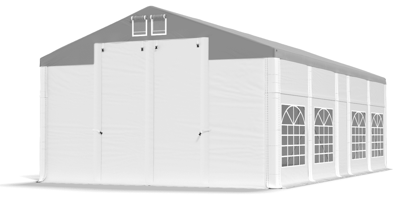 1 - Dach modułowy ogniotrwały FR PVC (polichlorek winylu) ok. 620 g/m2    2 - Podwójna wentylacja z obu stron     3 - Wjazdy typu Slide & Roll     4 - Mocne zamki YKK przy wjazdach     5 - Rzepy uszczelniające     6 - Podniesienie ściany bocznej ogniotrwałejFR PVC ok. 2 x 0,5 m(polichlorek winylu) ok. 620 g/m2     7 - Wymienne Maskownice z rzepami uszczelniającymi     8 - Ściany boczne ogniotrwałe FR PVC 2 x 2 m (polichlorek winylu) ok. 620 g/m2 - Okna witrażowe 140 x 130 cm     9 - Dodatkowy fartuch retencyjny
