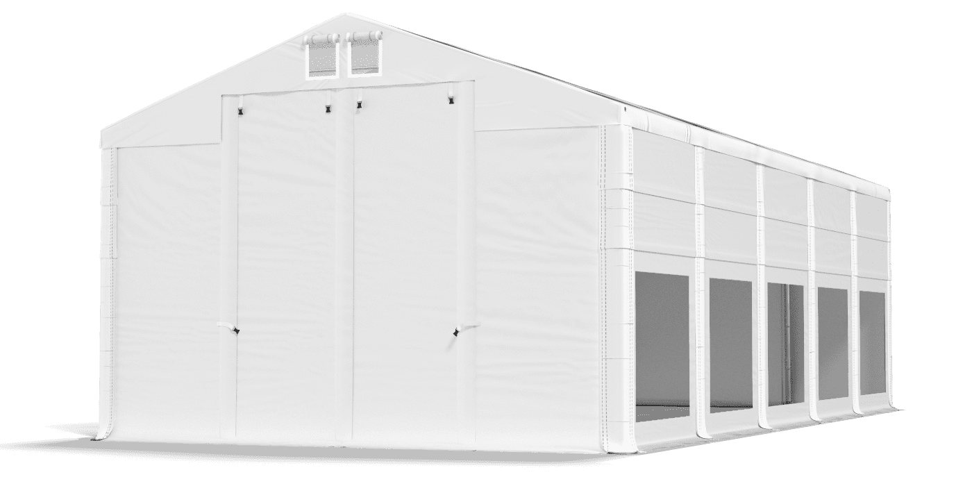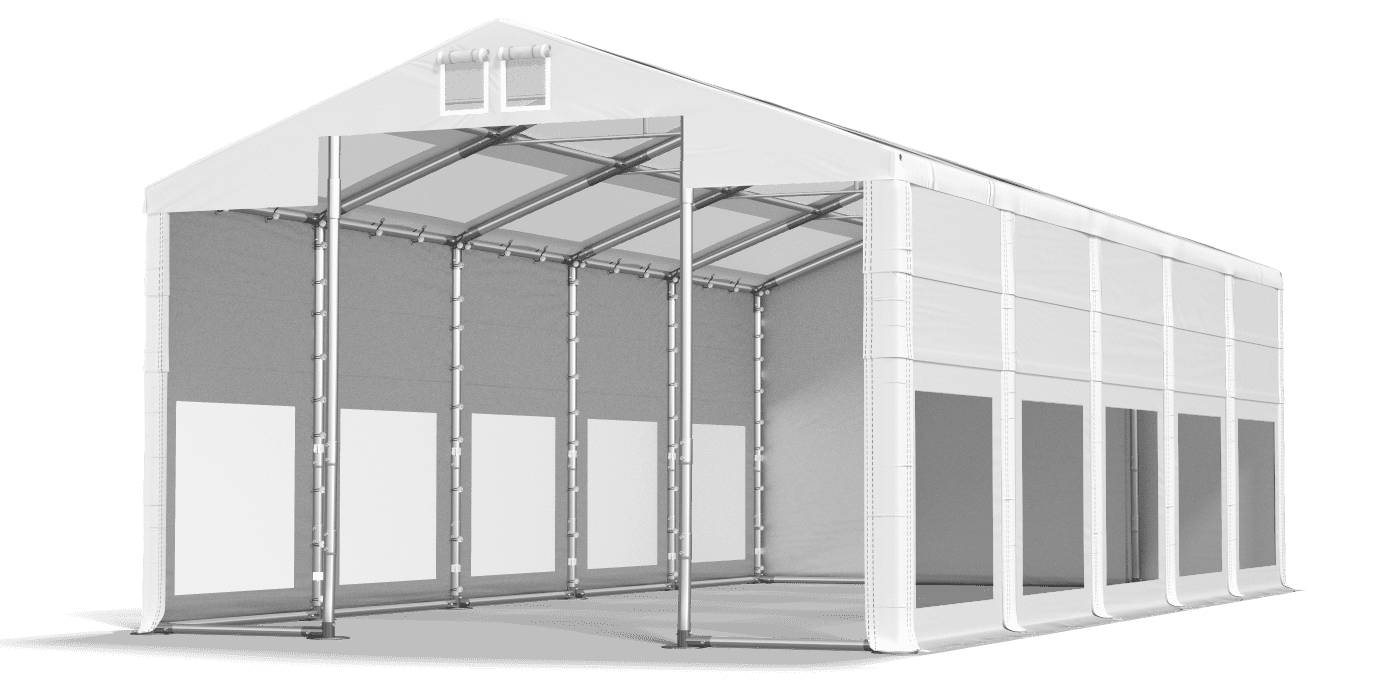 3. Otwarte główne wejścia/wjazdy oraz odpięte wszystkie ścianki z jednego boku namiotu.