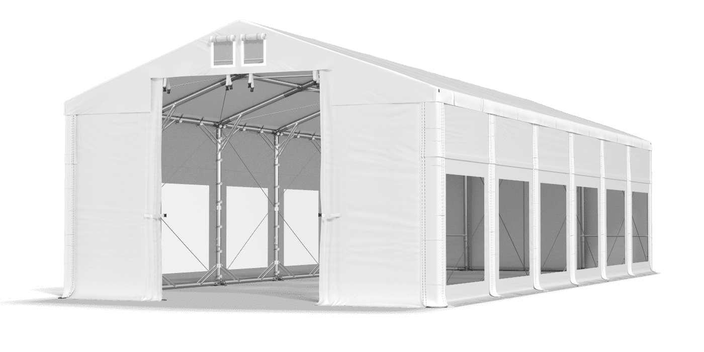 3. Otwarte główne wejścia/wjazdy oraz odpięte wszystkie ścianki z jednego boku namiotu.