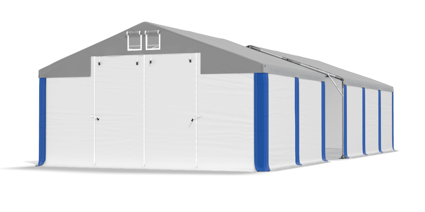 1 - Dach systemowy ognioodporny FR PVC (polichlorek winylu) ok. 620 g/m2 2 - Podwójna wentylacjapo obu stronach 3 - Wjazdy typu Slide & Roll 4 - Wytrzymałe zamki YKK przy wjazdach 5 - Rzepy uszczelniające 6 - Wymienne Maskownice z rzepami uszczelniającymi 7 - Ściany boczne ognioodporneFR PVC 2 x 2 m (polichlorek winylu) ok. 620 g/m2 8 - Dodatkowy fartuch odprowadzający wodę