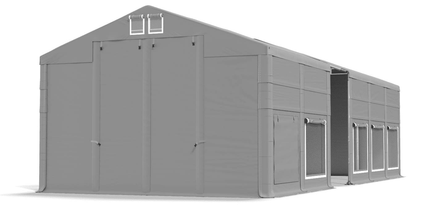 3. Otwarte główne wejścia/wjazdy oraz odpięte wszystkie ścianki z jednego boku namiotu.