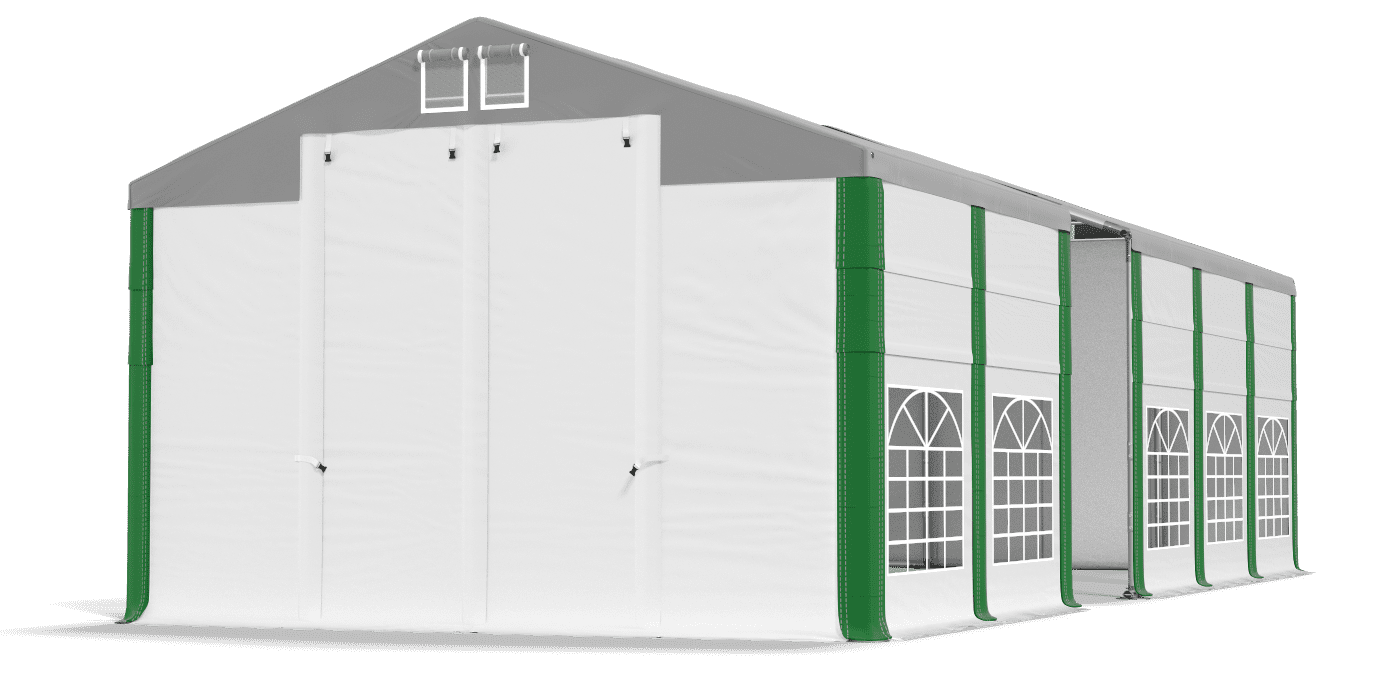 3. Otwarte główne wejścia/wjazdy oraz odpięte wszystkie ścianki z jednego boku namiotu.
