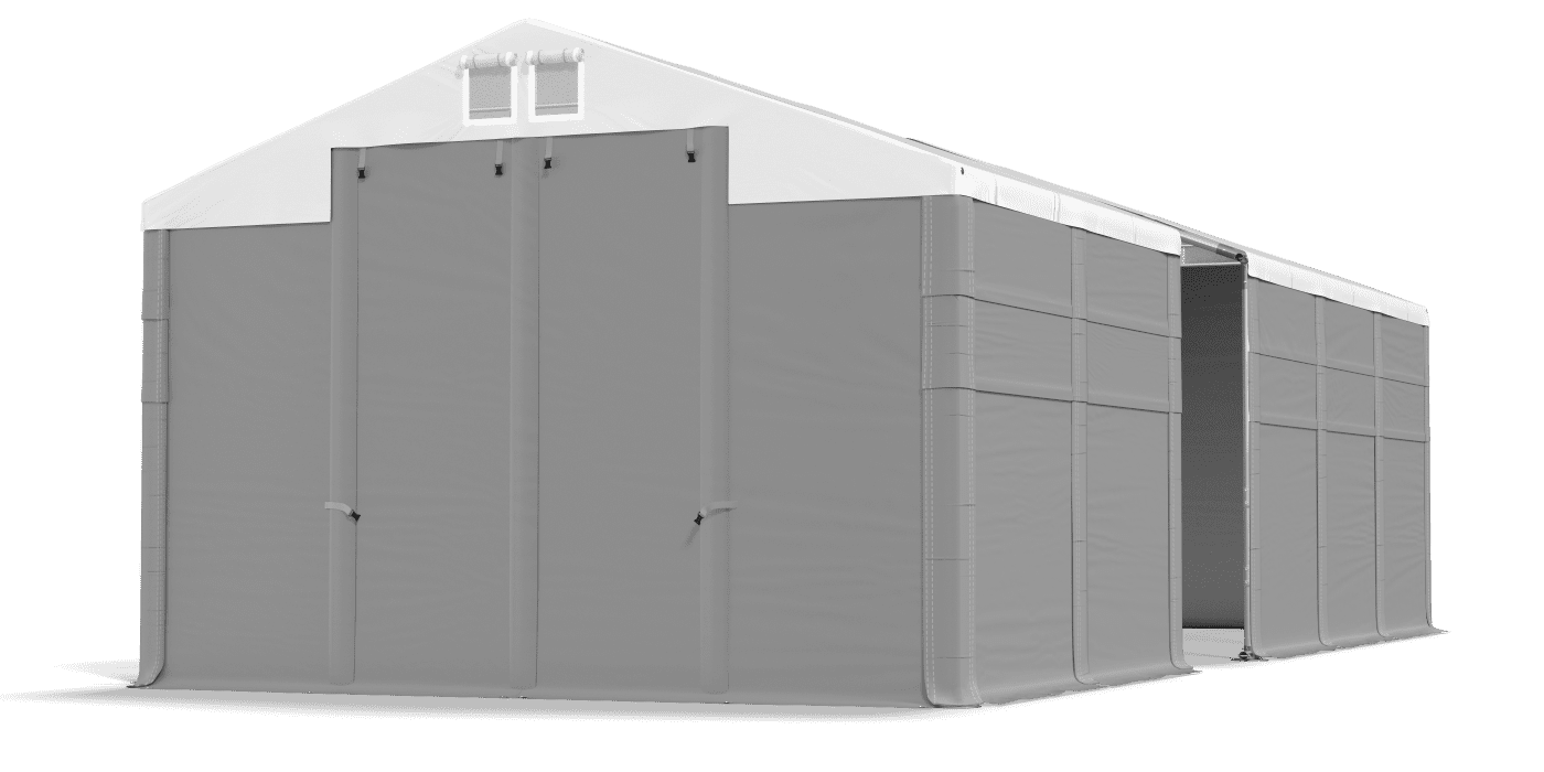 3. Otwarte główne wejścia/wjazdy oraz odpięte wszystkie ścianki z jednego boku namiotu.