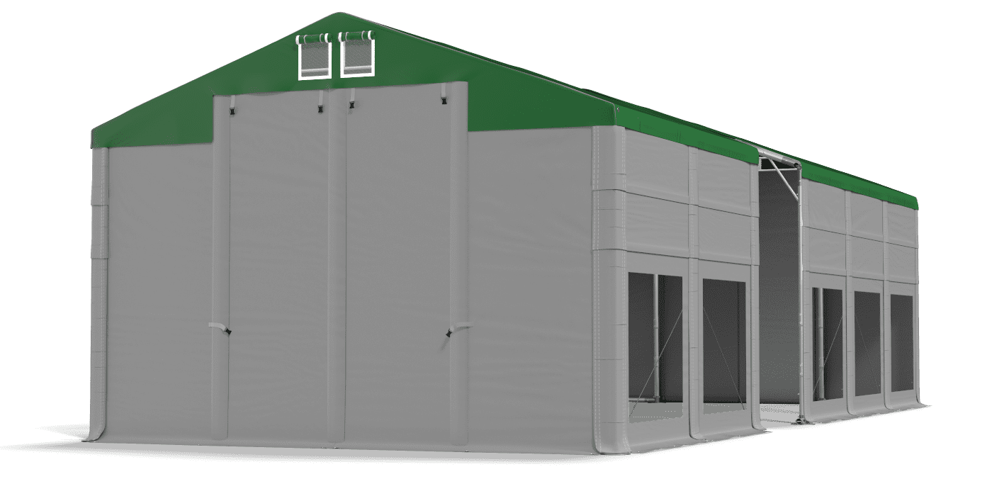 1 - Dach SD PVC (polichlorek winylu) ok. 560 g/m2    2 - Podwójna wentylacja z obu stron     3 - Wjazdy typu Slide & Roll     4 - Mocne zamki YKK przy wjazdach     5 - Rzepy uszczelniające     6 - Podniesienie ściany bocznej MS PVC ok. 2 x 2 m(polichlorek winylu) ok. 580 g/m2     7 - Wymienne Maskownice z rzepami uszczelniającymi     8 - Ściany boczne MS PVC 2 x 2 m (polichlorek winylu) ok. 580 g/m2 - Okna transparentne 144 x 148 cm     9 - Dodatkowy fartuch retencyjny