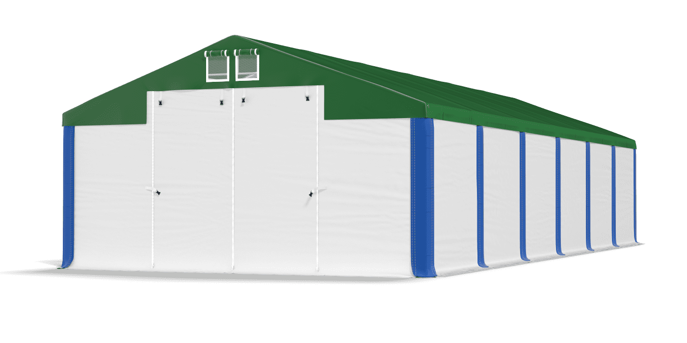 1 - Dach SD PVC (polichlorek winylu) ok. 560 g/m2 2 - Podwójna wentylacja po obu stronach 3 - Wjazdy typu Slide & Roll 4 - Mocne zamki YKK przy wjazdach 5 - Rzepy uszczelniające 6 - Wymienne Maskownice z rzepami uszczelniającymi 7 - Ściany boczne SD PVC 2 x 2 m (polichlorek winylu) ok. 500 g/m2 8 - Dodatkowy fartuch odprowadzający wodę