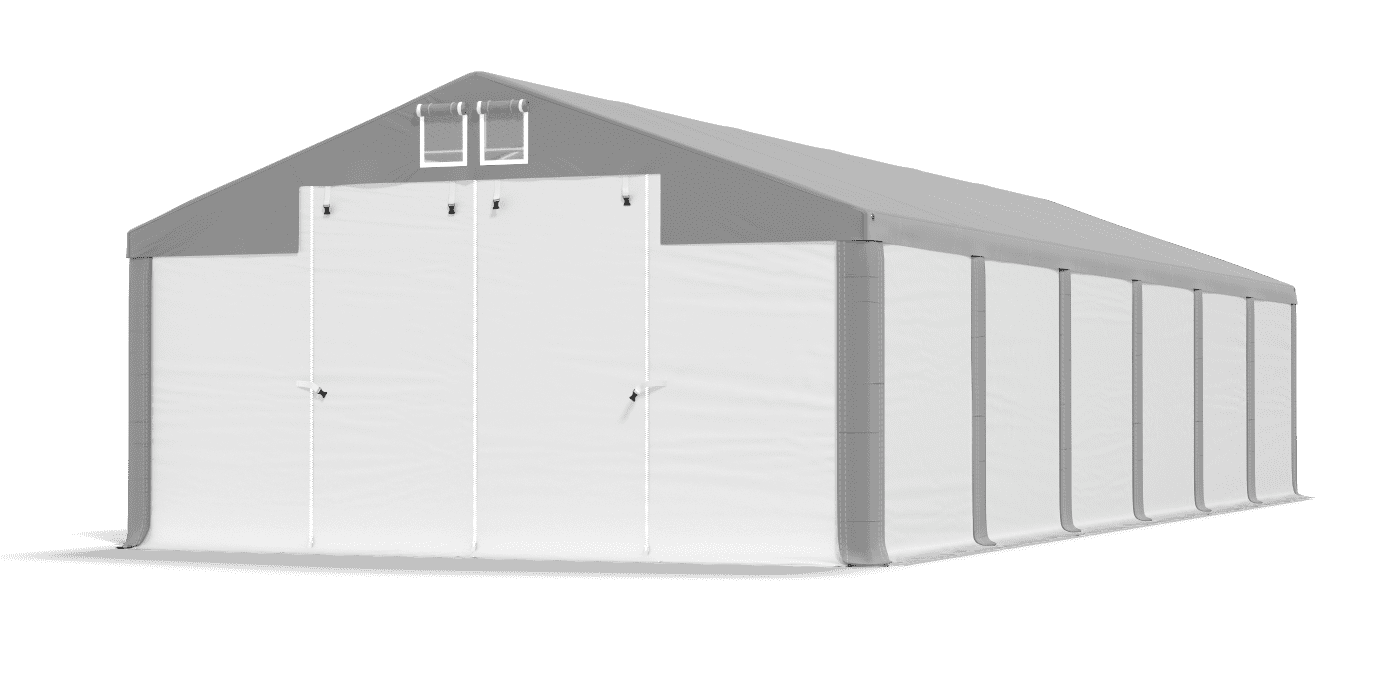 3. Otwarte główne wejścia/wjazdy oraz odpięte wszystkie ścianki z jednego boku namiotu.