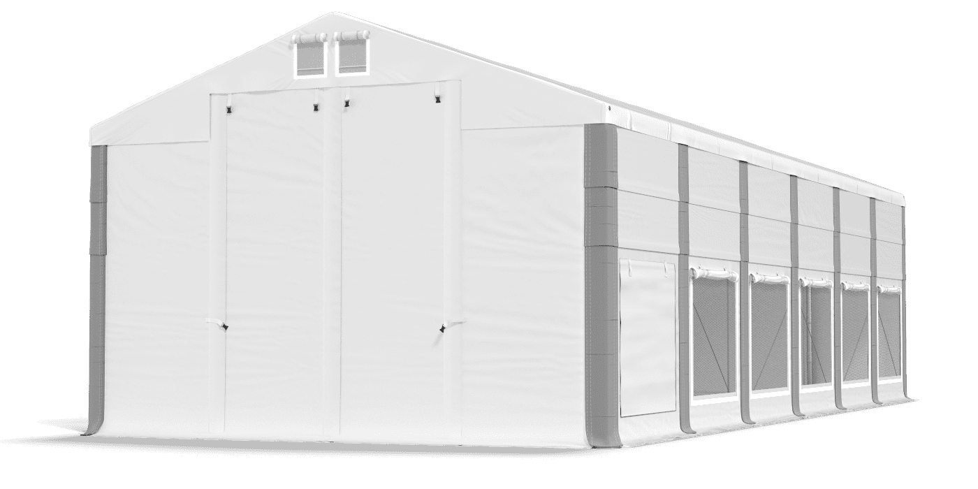 3. Otwarte główne wejścia/wjazdy oraz odpięte wszystkie ścianki z jednego boku namiotu.