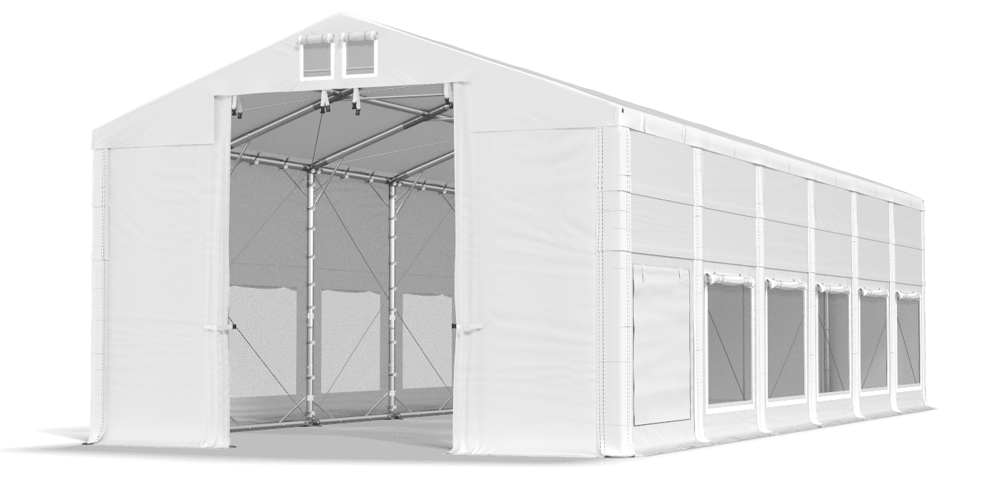 3. Otwarte główne wejścia/wjazdy oraz odpięte wszystkie ścianki z jednego boku namiotu.