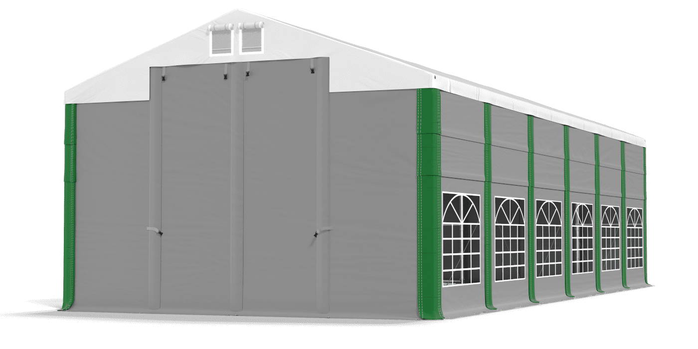 3. Otwarte główne wejścia/wjazdy oraz odpięte wszystkie ścianki z jednego boku namiotu.