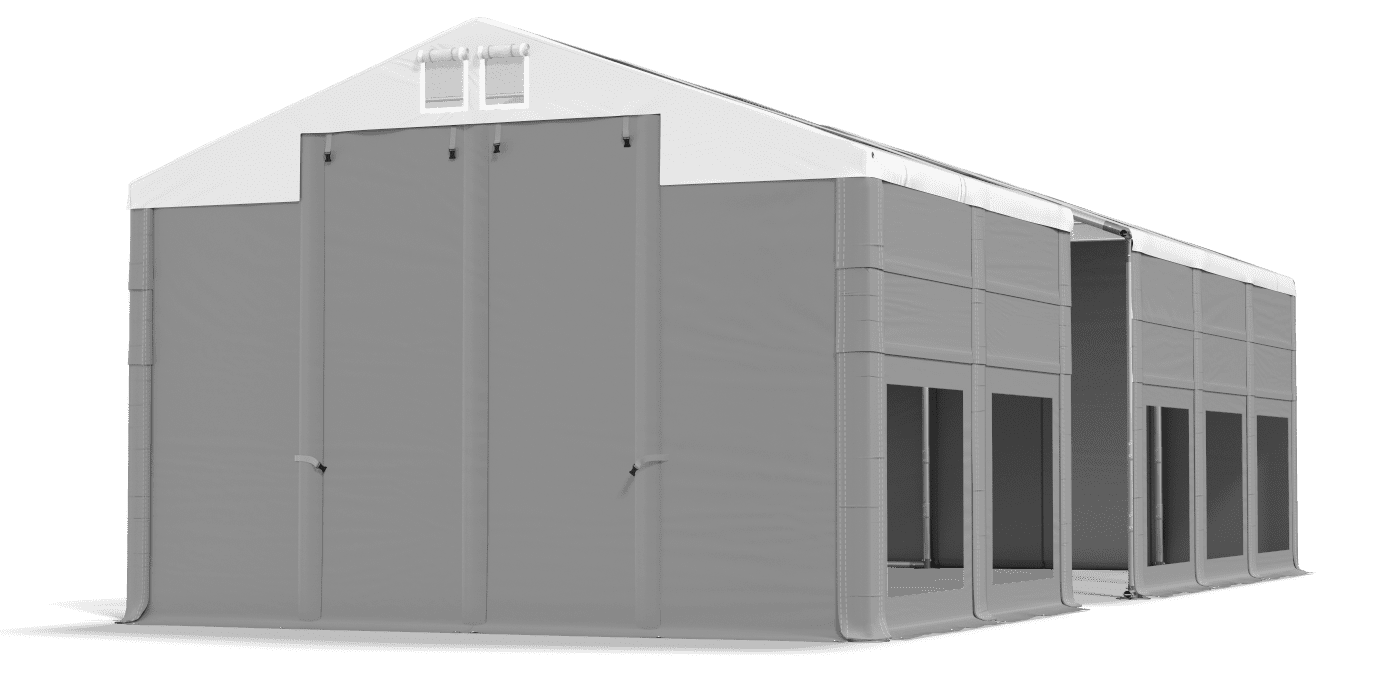 3. Otwarte główne wejścia/wjazdy oraz odpięte wszystkie ścianki z jednego boku namiotu.